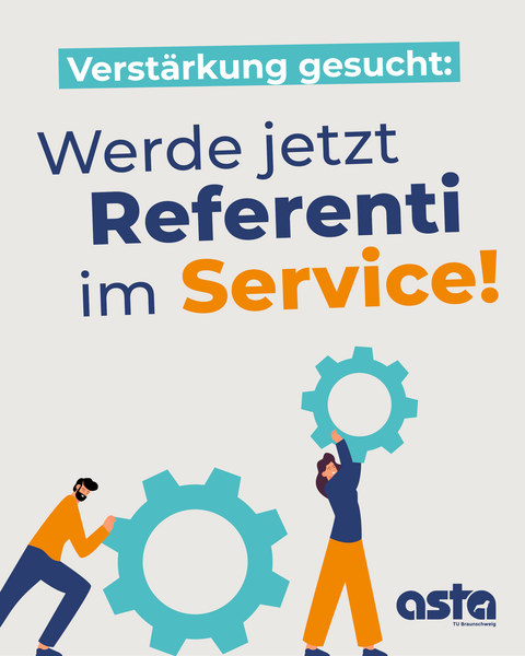 💡 Das Service-Referat ist der perfekte Einstieg, um die Strukturen der Studierendenschaft kennenzulernen. Als Service-Referenti hast du regelmäßige Arbeitszeiten und betreust den AStA-Service einmal pro Woche während unserer Öffnungszeiten und nach Absprache in der vorlesungsfreien Zeit. Vorerfahrungen und besondere Kenntnisse sind für die Mitarbeit im AStA-Service nicht nötig.