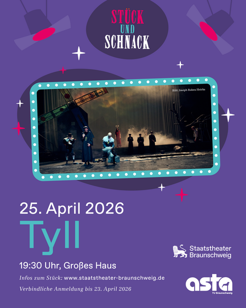 Da nur begrenzte Plätze verfügbar sind, ist eine verbindliche Anmeldung bis zum 23.04.26 um 20:00 Uhr erforderlich. Schreibe uns dafür gerne eine E-Mail: asta-kulturreferat@tu-braunschweig.de.