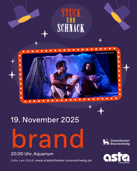 Da nur begrenzte Plätze verfügbar sind, ist eine verbindliche Anmeldung bis zum 17.11.2025 erforderlich. Schreibe uns dafür eine E-Mail und melde dich für „Stück & Schnack“ an. Wir freuen uns auf dich! asta-kulturreferat@tu-braunschweig.de.
