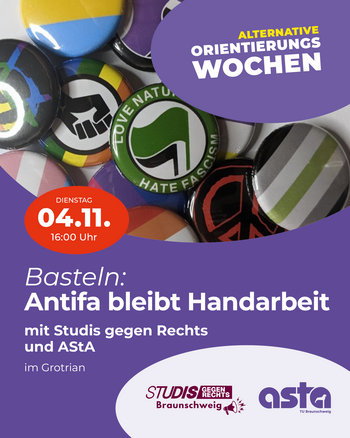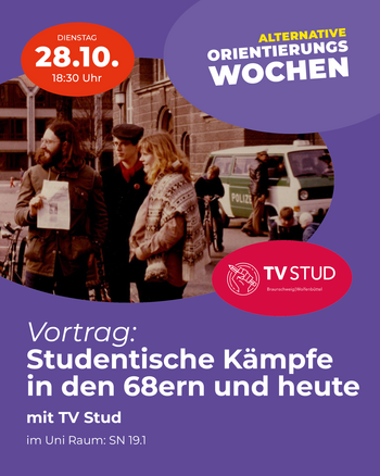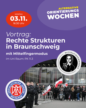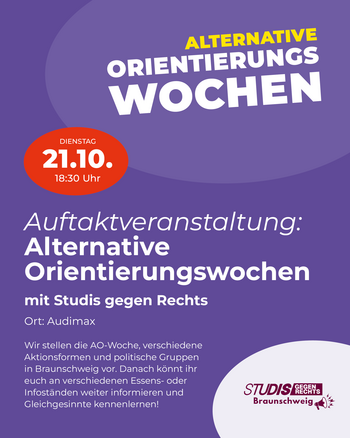 Die Alternativen Orientierungswochen sind ein Angebot zahlreicher linker Gruppen, die dazu einladen, die politische Szene in Braunschweig kennenzulernen. Veranstaltungen reichen von ersten Plenums-Erfahrungen zu feministischen Lesungen und antimilitaristischen Formaten.