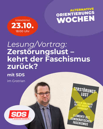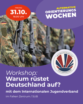 Mit mehrere Sondervermögen und das Ziel 5% des BIPs macht sich Deutschland auf dem Weg eine führende militärische Macht in Europa zu werden. Auch Waffenexporte werden in Kriegsgebiete immer weiter geliefert. Auf der einer Seite werden Unmengen an Geld für Kriegswaffen ausgegeben und die Wehrpflicht soll wieder eingeführt werden, während auf der anderen Seite immer mehr an Bildung, Gesundheit und Sozialem gekürzt wird. Auch als Studierende sind wir mit steigenden Mieten und Mangel an Wohnraum, höheren Semesterbeiträgen und kaputtgesparten Studiwerken konfrontiert. Parallel dazu fordert die Politik unsere zivile Unis, immer mehr militärische Forschung zu betreiben. Deswegen fragen wir uns: warum rüstet Deutschland auf und ist das im Interessen der Studierenden? Kommt dazu!