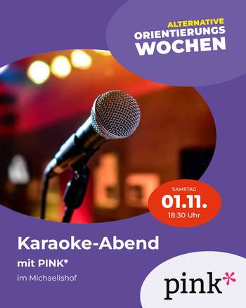 Manchmal muss Aktivismus einfach Spaß machen! - Deshalb lassen wir die zweite Woche der Alternativen O-Wochen mit einer deftigen Portion Karaoke ausklingen und stellen uns als Initiative vor. PINK* ist eine studentische Vereinigung an der TU Braunschweig, bestehend aus Studierenden verschiedenster Semester und Fachrichtungen, die sich für eine progressive und feministische Hochschulpolitik einsetzen. Als größte Liste im Studierendenparlament wirken wir auch im AStA mit und sind überzeugt, dass das Studium zu schade ist, um nur im Hörsaal und Labor rumzuhängen. Klingt gut? Dann sing mit und genieße einen entspannten Abend mit coolen Menschis – wir freuen uns auf dich!