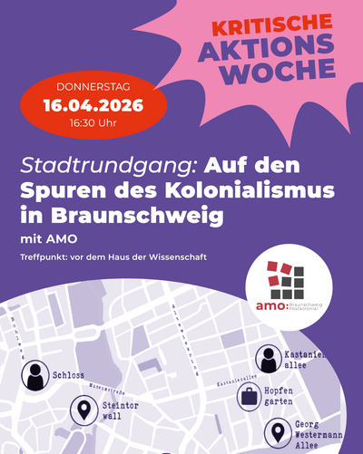 Dieser Rundgang blickt auf die historischen wie aktuellen Spuren des Kolonialismus in und um Braunschweig. An verschiedenen Stationen erfahren wir, inwiefern dieses Kapitel der deutschen Geschichte ein blinder Fleck ist, obwohl die koloniale Kontinuitäten uns an nahezu jeder Straßen ecke begegnen.